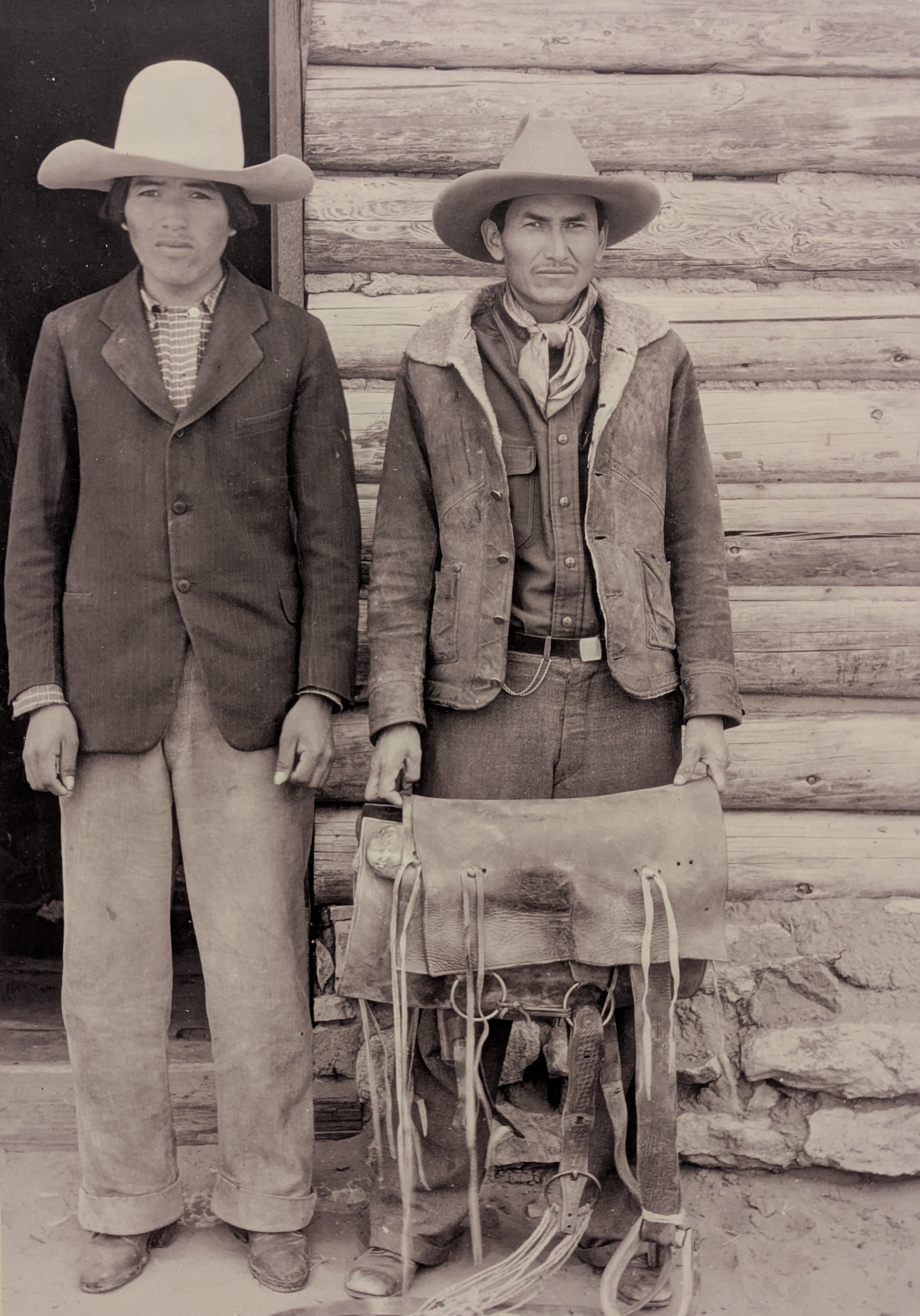A portrait of Big Belly’s nephew and Dannie Bia with old-style saddle. Red Lake (Tolani Lakes, Leupp, AZ), 1935-1936. Source: Maxwell Museum of Anthropology Archives 87.45.268