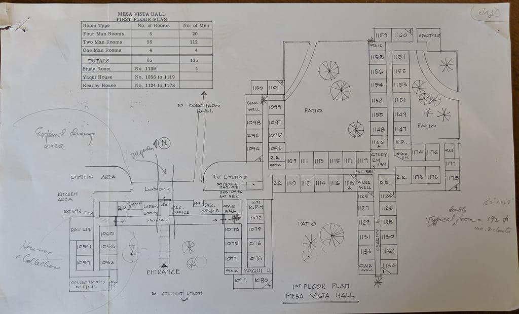 As of 1967 this was the design for the first floor of La Posada, reflecting the original design of Ernest J. Kump, lead design architect, and the alteration made by Sherman Smith. Source